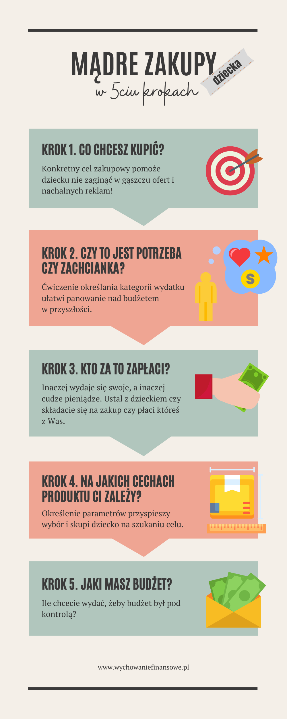 Wierzę, że nauka pięciu kroków zaprocentuje w przyszłości w postaci roztropnych zakupów. Nieważne czy moje dziecko będzie kupowało kolejną parę butów czy mieszkanie; chcę, żeby potrafiło sprecyzować czego chce, ile jest w stanie wydać i jak to wpłynie na jego budżet.