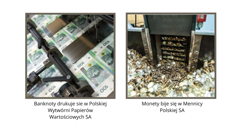 W Polsce o ilości i czasie produkcji monet i banknotów decyduje Prezes Narodowego Banku Polskiego, a produkcję nadzoruje Narodowy Bank Polski, który ma wyłączne prawo do emisji monet i banknotów. Samo wytwarzanie odbywa się w Polskiej Wytwórni Papierów Wartościowych SA (banknoty) i w Mennicy Polskiej SA (monety).